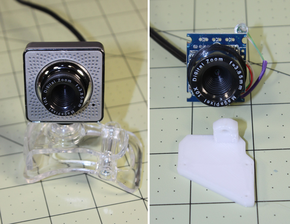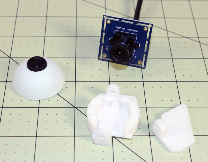 Fig. 3 Which camera? Gael used a Hercules Twist webcam for his eyes, but I haven't been able to easily source them here in the U.S - most of the vendors say its not available anymore. I think having two cameras will be needed soon because of the convergence of the VR headsets using your phone display and head tracking (here I mean moving the robot's head with yours, not moving to stay locked in on an object) so getting them cheap enough is at least part of the picture. I decided to try a cheap webcam (USB 2.0 interface) to see if it might work, although I am of course skeptical of the quality. At $4.20 per camera, (I got them from BangGood) I figure I can always use them as dummies at that price. It is advertised as a 12 megapixel camera, but that spec is often misleading in that software is needed to "enhance" the picture to that resolution, especially when they don't name the camera's video resolution in the description. It describes the cam chip as a 1.3 megapixel CMOS, which usually indicates a resulting 640x480 resolution 30 fps video, and that is indeed what you get. It does have a manually adjustable focus lens over the cam chip that has M12x.5 threads. The FOV is pretty narrow, but with those somewhat standard threads, it will fit a replacement wide angle lens like this one with a 115 degree FOV for $3.41. Good, clear picture with nice color. Above shows the webcam product on the left and what it looks like inside on the right. The illumination LEDs can simply be removed for use on the InMoov - I don't think there is room for night vision LEDs inside the eyeball. The black object on top is a small button that controls the LEDs and which can be removed, and the silver cylinder next to it is the microphone, which can also be removed. The camera mount shown in Figure 2 is shown under it, showing that it would be easy to mount. The PC board is 25x30mm. The black lens piece (iris) has a diameter of 22.4mm, a bit large for the nominal eyeball openings shown in Figure 2. I'll play with it a bit more, but I'll probably try a few others as well.