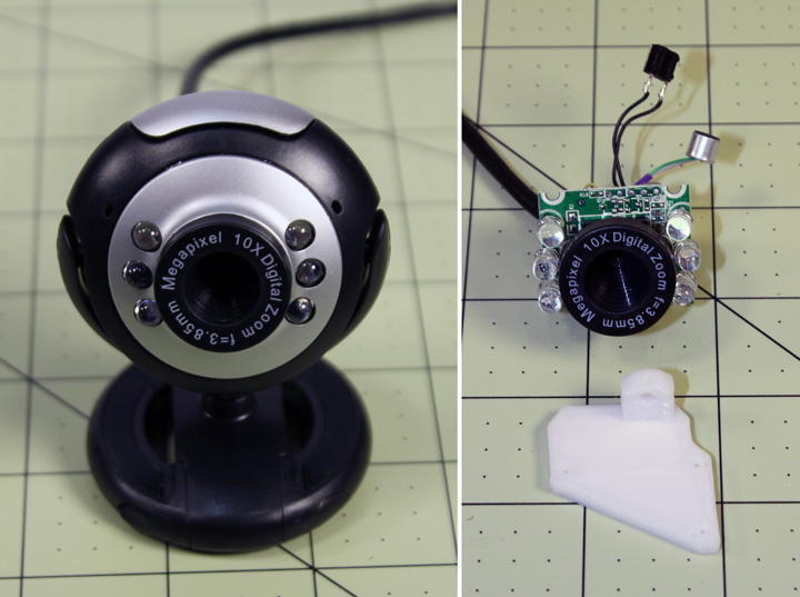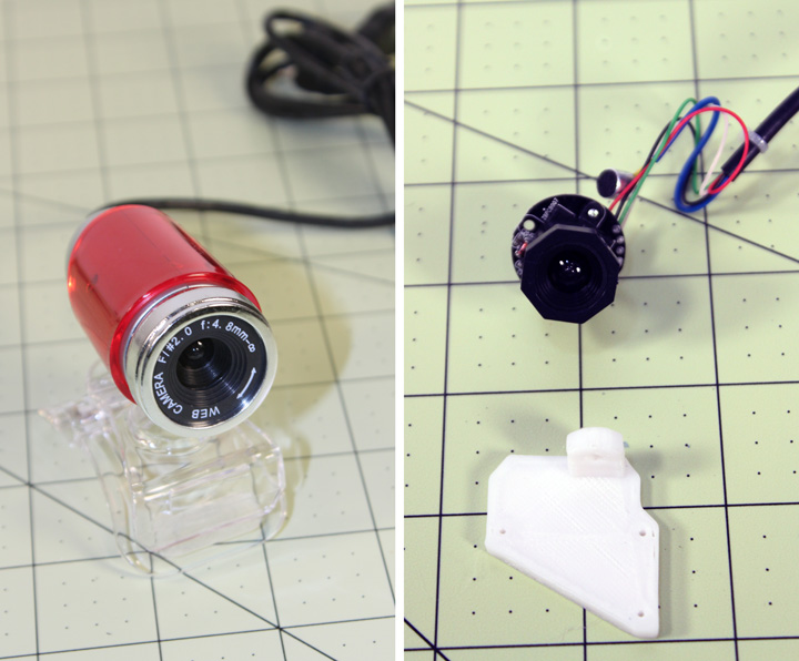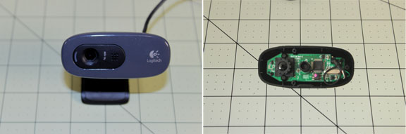 Fig. 7 Above is a Logitech C270 webcam I got on a Ebay auction pretty cheap, and I now see that some retail places are now selling them for $20-$25. They are a true 1280x720, but the video is kind of jerky at that resolution - it doesn't get reasonably smooth until you drop it down to 800x600, but the images are quite good. Its cheap enough, and clearly does much better imaging than the previous cams, but the printed circuit board shown on the right is about 28x55mm so it would be very difficult to get into the mounting area provided by eye mechanism and still allow both degrees of freedom. Also, the 60 degree FOV lens is glued in place - I saw where some sites showing how to hack this camera got lucky by forcing the lens loose to change focus, (it is "in focus" for 40cm and beyond, nothing closer) but I don't see replacement lenses available for it. It is smaller than the 12mm thread of the other cameras.