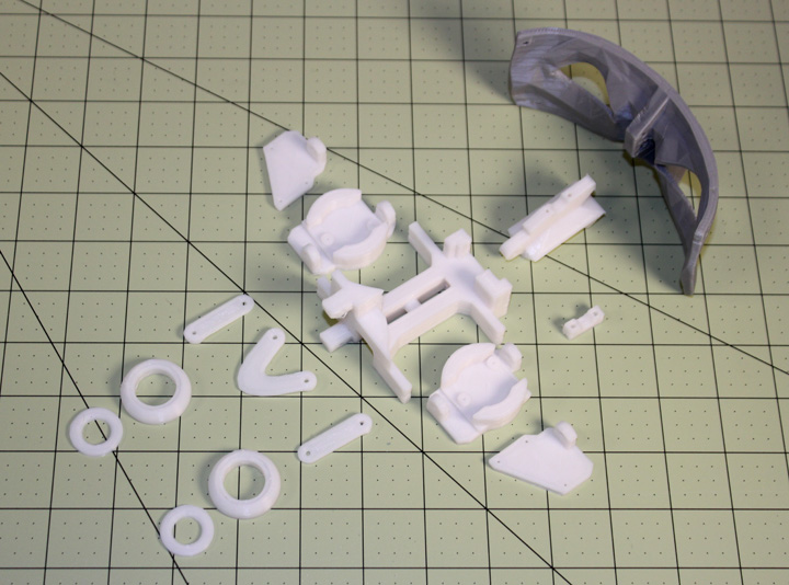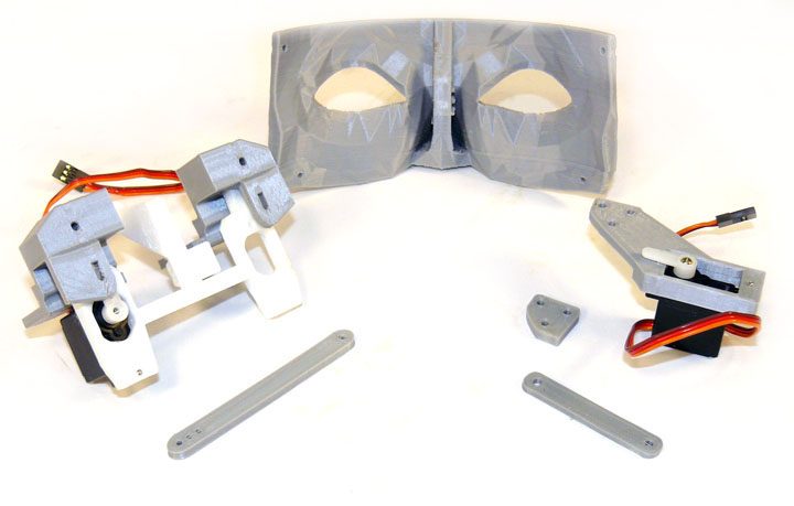 Fig. 1 Above shows the parts for the nominal eye movement mechanism. On the left is the white frame to support the camera holders (the gray pieces fitted on the frame) that lets the eyes move left and right. If you elect to slave the left-right motion of the eyes together (as opposed to being able to move them independently so you can have cross-eyed looks or do a "Marty Feldman") you only need one servo and a tie bar, as shown on the left. The fixture on the right has an identical servo that controls the up down movement of both eyes and is mounted at the bridge of the nose on the mask. Both servos are DS929HV's, and the front of the gray holders will have cameras mounted on them.