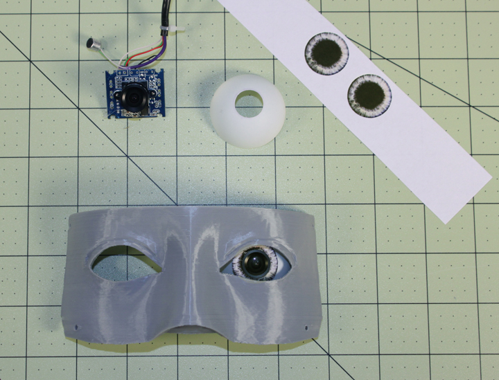 Fig. 8 I saw where one of the builders (sorry, I don't remember now who it was) used a ping pong ball as the eyeball, so given that it is light, thin, and easy to machine, I though I'd start with that. I wanted to see what a more realistic iris around the lens would look like. I sliced the ping pong ball in half by carefully rolling it into a fine toothed bandsaw, and just used a Dremel grinder bit to slowly cut the opening for the lens to a press fit size. On the web I searched for images of an eye iris, found one that was mostly grey, enlarged the pupil area for the lens, and sized the image to fit the 14mm lens opening. I printed the irises on just regular copy paper and cut them out with a sharp hobby knife, and took a look at what resulted in the above photo. I may be falling into the uncanny valley here, but I think I'll live with it a while to see if I like it. I like the way the lens catches a reflected highlight, like a real eye. I might spray the whole eyeball with the iris in place (without the lens, of course) with some glossy clear coat to give it a wet look as well. Fig. 9 After getting the pieces in Figure 2 together, it seems like the interpupillary distance is not apart far enough. In other words, the pupil in Figure 8 is too close to the nose. Sure enough, another builder, Alan Timm noticed this and put up some variations on Gael's V2 design, given here. Comments may be directed to gary at liming daught org. Thanks for viewing this build log! |