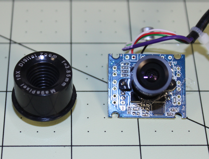 Fig. 6 Above shows the cam in Figure 4 with the $3.50 115 degree FOV lens I mentioned before. Next to it is the lens that came with the camera. This not only gives a wider view, but provides a smaller pupil size (14.1mm) that will allow a more realistic iris and eyeball effect.