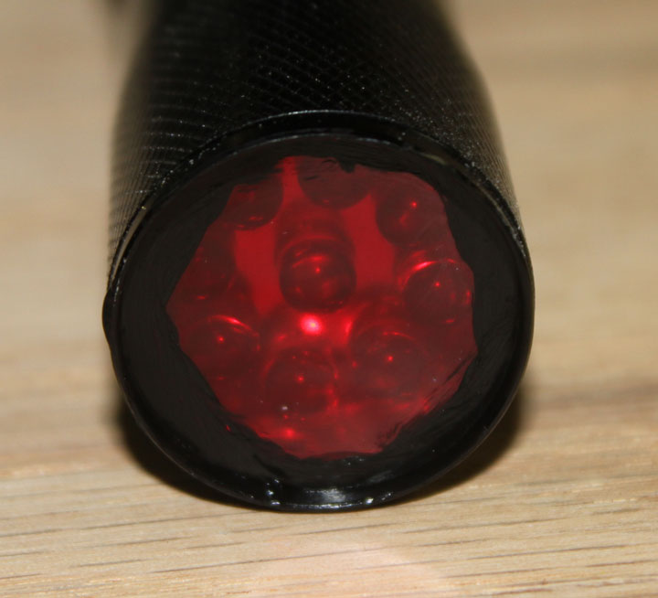 Cutting a perfectly round film is difficult, but it doesn't have to be perfect. I just took some black acrylic paint and painted around the perimeter (and not all that neatly, either, since it doesn't need to be) which not only blocked any stray white light, but acted a glue as well. Should the 9 LEDs prove to be too much light, I can always go back and paint a black dot over one or more of the LEDs to dim it. They are not high intensity LEDs though, so I think it will be okay. I "tested" the flashlight at an observing site one night with one of the commercially available red flashlights (it used a red emitting LED instead of a red filter) sold for astronomical use, and the light emitted appeared to be about the same. Although this idea has been around since just a few milleseconds after the big bang, what is new for me is getting a useful astronomical device for free! If you don't already have some rubylith, you might ask at your astronomy club for some spare pieces, or better yet, get a sheet to divide up at a meeting where everybody can bring in a free flashlight!