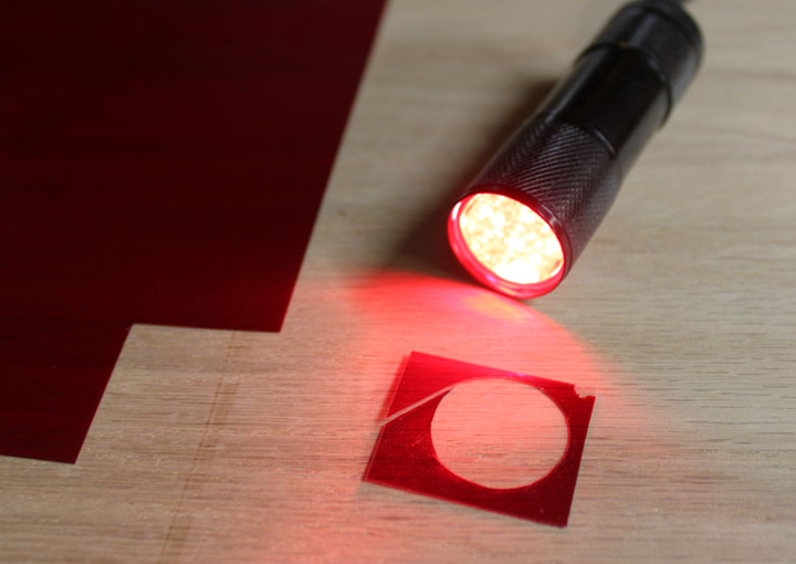 Here in the US, an import company called Harbor Freight Tools has advertised coupons for a couple of years now to get a free LED flashlight for just visiting the store - I managed to collect several of these freebies. One of those is shown on the right in the photo above. Above left is a piece of the rubylith sheet that I got to make my laptop cover. After tracing the diameter of the flashlight opening with a sharp pencil on a corner of the rubylith, I simply cut out the corner and then cut inside the line, trying to be somewhat careful. The rubylith circle was then a tad large, so I continued to make very small cuts until it fit on the lens of the flashlight. I then placed the rubylith on the lens with a drop of clear glue. The picture above shows the flashlight on with the rubylith in place, but the camera overexposed the light making it seem much brighter than it is.