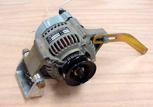 Above, the large piece of stainless sheet metal I bought from Harbor Freight as a drywall mud carrier for 3 bucks. I measured it at .0125 thick. I cut off the ends of it to use as test pieces, one of which is on the lower left This leaves plenty for the rest of the shields, or other stainless brackets that might be needed on the firewall. This stuff is much tougher to cut than aluminum! I then bought the two pipe fittings in the center of the picture (2 bucks for both) - a pipe nipple 1 1/2 inch ID and the pipe plug 1 3/8 inch OD. I drew circles in the middle of one of the end pieces to help center the pipes, and then put it between the two centered pipe pieces, all in a vise and closed the jaws. This made an impression in the metal just deep enough that fits the thickness of the grommets. There is wrinkling around the impression, slightly noticeable in the above photo, but I was able to beat it pretty flat around the edges. I then trimmed the sheet metal in the shape of the regular shield, and its ready for drilling the mounting holes and pass through. This method does require a strong vise, though. If you had a press, that would work as well. Firewall shields can be bought for 5-7 bucks apiece, so we're not talking about saving much money, but I was curious about working with stainless steel, so I gave it a try. Took me about 45 minutes, including the photo and this writeup. April 12, 2002 I think I've made up my mind about the engine. It will be an XP-360 with 9:1 compression cylinders, a B&C Alternator, Lightspeed Engineering's electronic ignition, and everything else, like the baffles, mount, and cowl the regular ones from Zenith. From an auction of parts from an RV I got a 2 year old B&C 60 amp alternator: