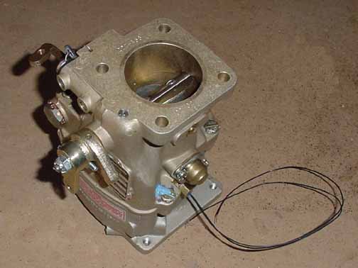 Above is the Precision (Marvel-Schebler MA-4-5 clone) carburetor. There is a bracket needed to hold the cable sheaths for the throttle and mixture controls. The top surface bolts onto the engine intake, the bottom attaches to the air box. The wire is from a temperature sensor I added by drilling out a plug on the side of the carburetor, and tapping 1/4-28. This way, if the temp in the throat nears icing conditions, I should hear a tone in my headphones, and be able to see the carb temperature on the engine monitor. Thus I can control just how much carb heat is needed. |