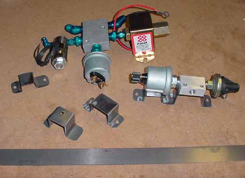 Above are some of the firewall plumbing pieces. The oblong assembly on the right is where the other end of the oil pressure line goes to. It is a 3 port manifold, with a oil pressure sensor on the left, and a oil pressure switch in the right. The switch will independently turn on and off the Hobbs meter, so the clock will be running if and only if the engine is. In the middle of this fitting is the port for another 45 non-restrictor elbow to connect the hose to. Underneath are some support brackets I made to mount these. The oil pressure sensor will be clamped to the support bracket under it with a hose clamp. The brackets are made from some .025 4130 steel in a 1 inch strip shown along the bottom. Likewise, I've made more brackets to support the 5 port fuel manifold and its pieces. Also, I've powder coated the brackets to prevent them from rusting. On the right of the 5 port manifold is the boost pump, on the bottom is the fuel pressure sensor, to the left is the primer solenoid (I'm not going to use a manual primer - saves running fuel lines into the cabin and back out.) The boost pump and primer will be wired off the same switch - down will be off, the middle position will be for the boost pump on, and the upper position is spring loaded (momentary) and turns on both the boost pump and the primer valve. This is essentially the same plumbing as the ZAC manifold, except I am using an electric primer. The top two fittings are for hoses that connect from the fuel pump and the other one goes to the fuel flow sensor. Originally, I was going to just connect the fuel flow sensor into the manifold, but I found out those sensors must not be mounted near any bends in the flow, or inaccurate readings can result. From the sensor, a hose will go to the carb.