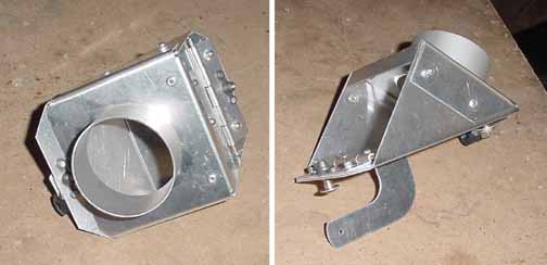 Above is the cabin heat door, a kit from Van's for $30. Took about an hour to assemble. You will need a dimple die for use with your hand held rivter because the flat side goes against the firewall and must be flush. It comes complete with clamp for the control cable and mounting hardware. It also comes with solid rivets, but I used the Avdel rivets. A 2 inch SCAT tube goes from here to the exhaust muff, which is driven by intake air from around the prop inlet. The arm on the bottom right is controlled by a simple Bowden type cable from the instrument panel, and either vents the heated air inside, or it vented down to the bottom of the cowl.