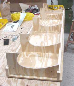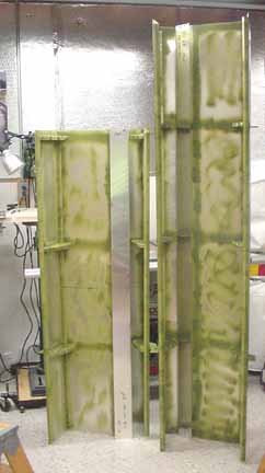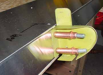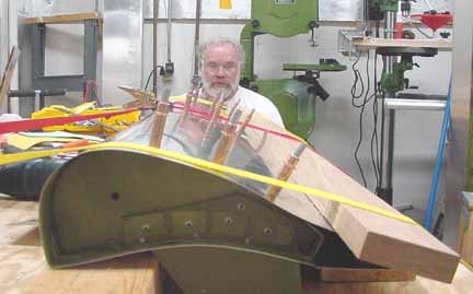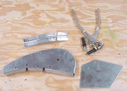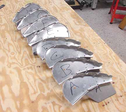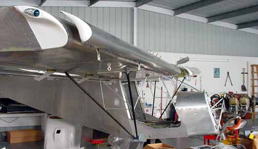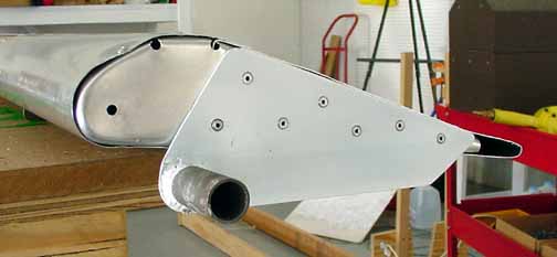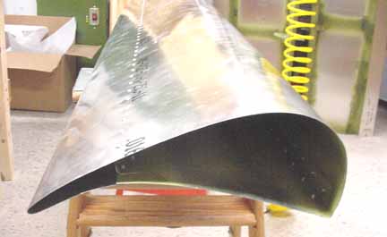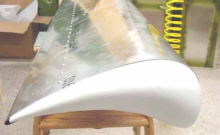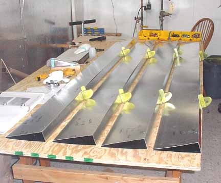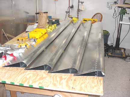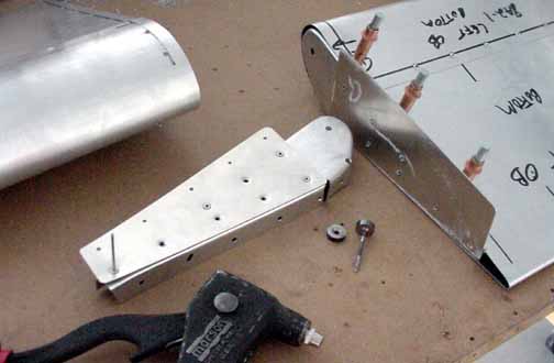 Rode out to Mexico to pick up the wings and slats and flaps kit. Trip report here. April 5, 2001 Both the flaps and slats come in two sections about 2.2 meters each for each wing, so they can be worked on in a smaller space. Before starting, it really helps to take a moment and mark on both ends of each section where it goes on the airplane. One should say "bottom, left, IB" (inboard) and the part number, and so on for all four. This helps making sense of the position of the brackets. Here a clamp is used to hold a standard "L" against the flap support bracket so the nose rib can be positioned flush with the skin. Make sure the part of the flap support bracket that sticks out from the bottom of the skin is at least 25mm in order that there is enough bolt hole clearance when mounting these on the wings. Here the nose skin is clecoed into place. Note the flush tack rivet behind the bracket that keeps the skins in place. After careful measuring, you do this eight times. The skins came pre-bent, and it felt likely that I would put a wrinkle in one if I opened it up enough to spray into it, so I am leaving the interior of the trailing edge flap skins without corrosion spray. For the same reason, it is nearly impossible to get behind the holes to do an adequate deburring, at least the way I've been doing it which is to run a board down the inside of the flap with the clecos out. You would think that somebody clever enough to think up a cleco would have come up with a tool to deburr the other side of a hole. I think I will ask the mailing list folks what they are doing. all four of the flap sections are ready for the nose skins, splice plates, and tips. The nose skins are pre-bent, which makes the next step a lot easier. Cut outs for the brackets are made, and the nose skins slip into place and are riveted. 6 hours. Here are the flaps with the nose skins riveted in place. 9 hours for this step, but it went well. April 15, 2001 Arrrgh! I was inspecting my rivet lines while I had the flaps standing up side by side, and something didn't look quite symmetric. After measuring, I discovered that one of the hinge brackets was mounted exactly 20 mm off of where it should be! Since they must line up with the flap arms on the wing, this is a real problem. I have no idea how it happened, I can't believe I did it, even now. I don't think there is any way I can drill out 128 rivets without ruining a trailing edge piece, and new nose skin will definitely be required. I will call ZAC Monday to see how much replacement pieces will cost. April 18, 2001 I suspected this step was going way too smoothly. "Measure twice, cut (rivet, drill, etc.) once" is very true. Bought the replacement pieces and made a new one fairly quickly. Mosr hassle than effort. Jump to August, 2003 Here the splice pieces are being attached to the end caps. Flush rivets will be good here, so each hole is dimpled with a dimple die (shown in the picture above the hand riveter) which makes an indentation on the two pieces to be riveted. A flat (non domed) head is put in the hand riveter, and a flat face results. Here, the outside arm of the Friby-Haas No Slot Flap mechanism has been powder coated and is also flush riveted in place on the inboard end cap. The tube pointing toward you goes into the side of the fuselage into another arm. Here, the pivot point for the flaps on the side of the fuselage is determined by shining a point laser through all the holes of the flap support arms, which puts the pivot point right on the money. Back to April 18, 2001 Constructed the slat jig for the next step - all supports and rails were cut at the same time, so they all line up - about 4 hours: Checked the slat jig template against the fiberglass tips - they line up pretty well. I will finish the last flap and then onto the slats. April 28, 2001 Finished the flap skins and drilled and cleco'd the end ribs on the flap centers. Can't do the root or tip ends until they are mounted on the wing, so I need to make a jig so that they can be stored until final assembly. 4 hours for that. April 29, 2001 Cut 8 pieces of standard 'L' to make some attached flanges for the slat ribs. The Jilson cutting tool was perfect for that, making an 1/8 inch slot right up to the L wall. In the manual, it shows the spacing for the slots in the "L" as 35-30-30-45. You need to make 4 this way, not all 8. The other 4 are reversed, or 45-30-30-35. Here are all 8 of the slat ribs with the attached supports and "L" cleco'd together. Now to deburr them and prime. About 3 hours for the 8 slat ribs. May 6, 2001 Here are the four sections of the slats with the ribs and nose stiffeners in place, standing on end - on the left are the two I/B sections with the root end upright. They are kind of nested together so it is hard to see them as separate pieces in this photo. On the right are the two longer O/B sections with the wing tip upright. Now they are waiting to be wrapped together and joined. 13 hours for this step. Since the revised manual says it is best to wrap them as they will be joined (I/B slides into the O/B), and since how deeply they slide into one another is dependant on the slat support distances taken from the completed wing, I will wrap the I/B sections but wait until the wings are closed to wrap and rivet the O/B sections. Here the left I/B skin has been wrapped around the top, making sure the edges are still true and flat while drilling and fastening clecos. This is how the finished curve turned out, and this is the fit of the fiberglass tips resting inside the skin. It will be drilled and riveted on final assembly. I hope all those fingerprints will clean up ok! At this point, I have 4 flap segment, two per wing (as in the photo above) and 4 slat segments like the one above, 2 per wing. The segment for each wing will be joined when the wing is complete so the brackets on the flaps and slats can be fitted to the wing brackets. 6 hours to wrap and rivet the slat sections. Jump 