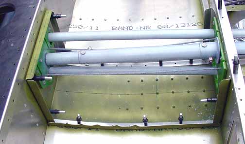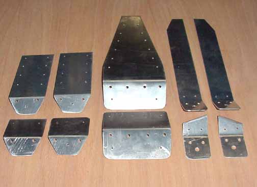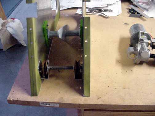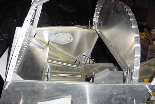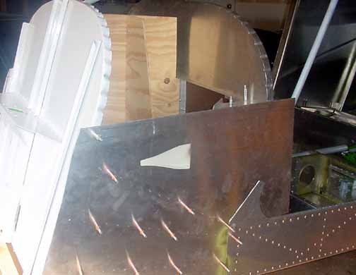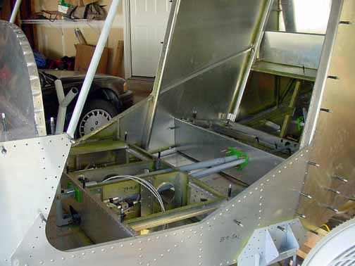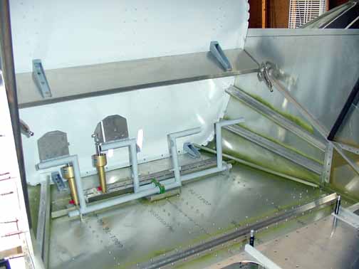 July 3, 2002 Above, the firewall has been painted, the cross support drilled, riveted, and bolted in place along with the engine mounts. The fire wall is only clecoed and bolted at this time. Also, both side skins are primed, drilled and clecoed, but the outside edges are still untrimmed. If I had it to do over again, I would NOT have mounted the engine mount brackets (the gray triangular pieces above) until I have the engine mount that goes on the other side of the firewall and could see how well that lines up with the predrilled holes on the firewall itself. The manual calls your attention to not letting the drill wander while drilling, which leads you to believe there is an exact fit called for. However, the engine mount holes may not match the pre-drilled holes on the firewall by quite a bit, and that 4130 steel doesn't give much. So, get your engine mount, and use it as the drilling guide, not the predrilled holes. So far, the only deviation from the plans I have made are the wing camera/light mounts, the aluminum fuel lines instead of rubber lines in the wings, and the removable fiberglass wingtips. I am going to deviate a couple of more places here - I need the instrument panel to be a bit more forgiving to the knees. Raising the panel would be a bit difficult - the top skin would need to be larger than what I have. Moving the instrument panel forward (away from the pilot) looks pretty doable, though. Since the top skin narrows as it lays forward, I might have to narrow the panel a bit. Since I only need to move it forward 20-30mm, there shouldn't be much to modify. I will re-cut the template and see how it fits. Above, the instrument panel jig is back in place, the instrument panel is 30mm forward of where the plans locate it, and the gussets on the sides of the panel are drilled and cleco'd. There is still plenty of room behind the panel, and I didn't have to modify the panel at all. Also, one other deviation from the plans - I located and cut the NACA air vents on both sides of the forward side skins. (NACA stands for National Advisory Committee on Aeronautics, a precursor to NASA, and they published a lot of research in the 30's-50's on airfoils and other airplane design issues. One of the reports concluded the above vent design presents the best vent pressure with the least amount of additional drag for subsonic flight. It is usually called a NACA vent.) The fiberglass piece behind the skin is one that Van's sells for just this purpose. On the inside, a 2 inch piece of SCAT duct is clamped on it and rather than take up panel space, I will make a mounting bracket for the eyeball vent right under the gusset on each side. The fiberglass vent will next be epoxied and riveted in place. It is easier to make this cutout now. Having good ventilation available (but able to turn it off!) is a safety issue as well as a comfort feature. Additional weight for the vents, including fiberglass, hose clamps, flange, eyeball vent, and hose is 8.2 oz per side, or 16.4 oz total. Here, both sides are done, and you can see the reinforcement angles on the cabin frame, and the fiberglass vents from the other side. Its all ready for the top skin to be drilled and cleco'd. One more deviation is to add reinforcement to the seat belt attachments. I saw a picture once of a seat belt attachment that failed on an emergency landing - the AN bolt just pulled through the aluminum end, so I am going to double that area. The pieces in the top row are the .063 belt attachments that come with the kit, and the pieces below are the .063 6061-T6 pieces I have added to the ones immediately above. The two left pieces are the outboard front lap belt attachments, and the middle one is for both the inboard front lap belts. The two right pieces are the rear outboard lap belt attachments. The inboard rear lap attachment is steel, which is already roughly twice as strong as aluminum. Total weight addition of the lower row of reinforcements - 3.1 ounces. Above are the belt attachments reinforced with the thicker pieces and solid rivets. The other holes are pilot holes for the final installation. Above, I've removed the supports behind the rear seat to make it easy to install the elevator bellcrank and the rudder pulleys. There are two sets of numbers about where the bellcrank goes on these brackets, depending on when you pulled the drawing off the ZAC website. The later numbers weren't right for me. I had to raise the location of where this bellcrank went when I installed the rest of the controls because the push rod for the elevator would rub against the flap torque tube. I needed 3-4 mm clearance. I ended up with the center of the bellcrank at 80 mm instead of the 76 on the drawing. The pulleys are enclosed so that the cable cannot come off the pulley. The wired flap actuator, viewed from the bottom. The wires go off to the flap switch on the panel and the power from the fuse. They are applied with ring terminals, heat shrink, and thread locker. To the far right is a runaway contact in case the up limit switch fails. It is an 8 gauge solid copper wire bent to make contact with the silver press fit ring if it goes past the up limit switch. Power from the switch is applied through a small hole drilled in the opposite end, and will melt the fuse if the limit switch fails. The wire is covered on both ends with heat shrink as well. Mark well the opposite ends of the wire, cut to the length needed to reach the final position of the flap switch, as each one is attached - it will save a lot of confusion later. At this point I attached the appropriate wires to the switch and a car battery to make sure everything was working. Here the actuator is installed with the controls in place. I found I had to widen the area in the green bearing material to allow the tubes to pass, but they have changed the dimensions on the drawings since. I would start with the dimensions on the drawings, and adjust from there until the controls move freely