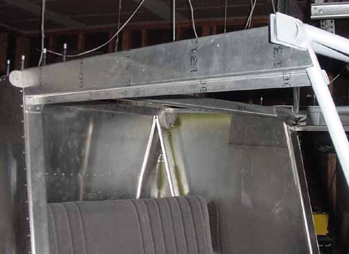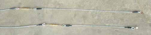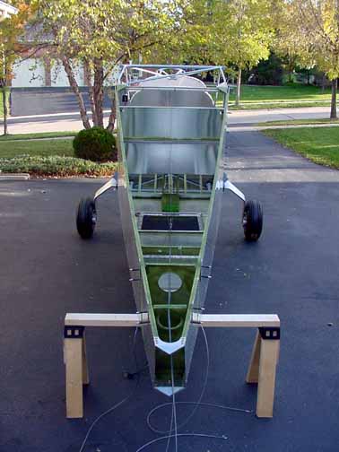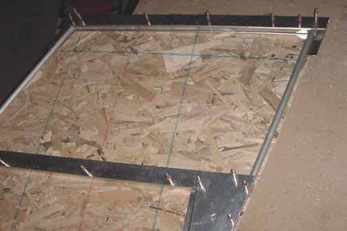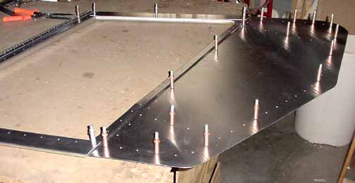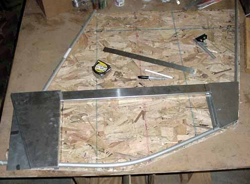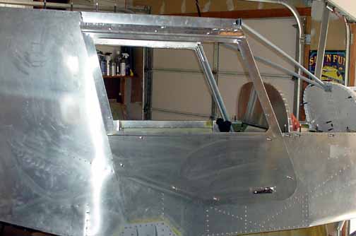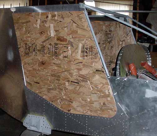 Made up the cables that go from the pedals to the rudder, and from the elevator bell crank to the elevator, which are shown above. On each end of a cable section is a nicopress fitting. A how-to for the nicopress is on this page. The right hand side has a shackle at the end - a shackle is never torqued tight by a bolt - a castle nut or clevis bolt should be used to allow the shackle to move freely. In the middle are turnbuckles, which will be tightened and safety wired on installation. These turnbuckles will be positioned just above the access door under the fuselage. Above is the fuselage wheeled out onto the driveway and the tail pulled down on a sawhorse for better access to the interior. It really pays to not rivet the top of the fuselage until the last so that you can get to the cables, hard to reach rivets, etc up until the end of the project. The cables have been strung and are just resting out the end, waiting for the tail assembly. Time to do the doors. Start the doors by making sure you've read through all the instructions, especially the errata sheet, as usual, and then hang the door sill. This involves trimming the edge pieces away from the cabin frame tubes as shown in the picture below. Make the forward end fit perfectly by sneaking up on a good fit, and then cut the aft angle. Note that the upper part of the sill over laps the top connector plate that joins the cabin frame with the rear fuselage, so it must be drilled to match the holes in the plate. Once the sill is in place, you need to hold a piece of plywood over the door opening so that the door opening can be traced onto the outline. You can hold the plywood up just under the wing attach points, and it must clear the strut/landing gear assembly on the bottom. In order to do this, the plywood should be about 39 by a full 48 inches wide. It should also be flat in order to get a good trace. I found nearly all of the 3/8 plywood at my home improvement warehouse to be warped, and I thought 3/4 material to be too cumbersome, so I used some of this 3/8 pressed chipboard: After cutting it out and making sure it has a good fit, I marked it "right side" and "inside" and "outside", and then did the left door template the same way.