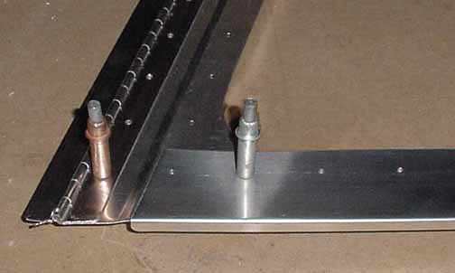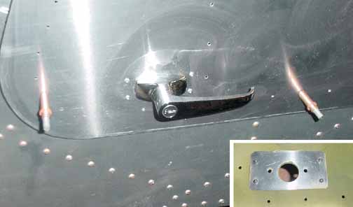 Here, the right side door template with the inside surface facing up has the tubing placed on it, the 6 mm reference line drawn around the bottom and sides, and the finishing nails driven along that line to hold the tubing in place. Once you place and fit the rear gusset (the sheet on the right) you measure 650mm between the inside of that to a line perpendicular to cross channel. Aligning the front gusset with this line tells you where to place and trim the front gusset, and where to trim the front edge tubing. The two top channels are trimmed to size and drilled and clecoed, completing the inside frame. The manual describes a 1/4 inch margin all around the frame, but does not take that into account when measuring the cutting lines for the top channel. Adding this back in makes a good fit. The inside of the frame is then primed and riveted. Here, the door frame has been flipped over and the bottom skin cut to fit per the manual. Also, the side panels that will cover the edge of the windows is in place, and everything is drilled and clecoed. Here is a closeup of how the frame overlaps the top door edge, and the door hinge has also been drilled and clecoed in place. The ends of the hinges have had the hinge wire shortened slightly with 1/16 inch holes drilled in the ends and safety wired to prevent the door hinge from going anywhere. Only the inside of the door is riveted at this point. The new handles are not the ones shown in the manual that have a nylon spacer - the new ones just attach to the outer skin with two small machine screws. The handles are substantial, and I thought a bit heavy to just attach to .025 with a couple of screws, so I added a doubler plate behind the handle, shown in the insert. Extra weight for the two plates = 4 tenths of an ounce, hardly worth mentioning. Also, I've powder coated the inner door latch. The picture below was taken during a trial fit of the door, just before final riveting. Since the screws that attach the handle will be covered by riveted skin, I will apply threadlocker to the screws before riveting. And here are the finished doors, just cleco'd by the hinges in place for now. Also, the outer skin is just cleco'd in place because I've been warned not to cut or drill the lexan window material while its cold, so I will wait for a nice warm day.