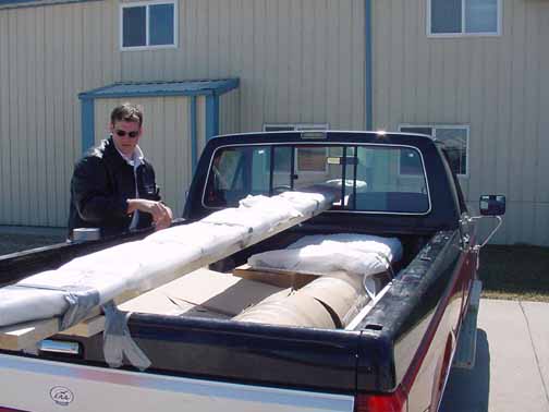 Well, today we picked up the wings, fuel system, and Flaps and Slats kit from Zenith Aircraft. Even though the garage won't be ready for a while, I looked through the online assembly manuals and realized that much of the slats and flaps can be done on a smaller table, like the elevator and rudder. So, the day before I was to pick up the wings, I called and asked them if I could add the slats kit, and they said they would! They are very nice folks to work with. Also, they said they might be able to take my son for a demo flight as well, weather permitting. I know that one of my rudder workshop buddies picked up his wings kit in a pickup truck by letting the 14ft wing spars rest on the window sill of his cab and the top of the tailgate. The day before, I picked up a couple of 10 ft 2x4s and screwed a cleat on them to keep it from sliding back. I threw a roll of duct tape in the truck, and hoped this would provide a good bed for the slats to rest on. (Yep, that's an EAA sticker on the back.) Once we got there, Shirley took the order and Donna has already pulled the parts and packaged them. After getting the truck loaded, we taped everything down for the ride home. Those rolls are the wing skins, which are normally 12 ft long. It takes at least 2 people to roll and unroll them, though. In this shot are the complete wings, the slats and flaps, and the 2 fuel tanks. I don't think a trailer was really needed. Now for the demo ride! C-GECX has a new prop since I saw it last - they said this wooden Sensenich was about $1000 cheaper than the metal one, and much lighter out there on the nose. Of course, it is much more susceptible to nicks and dents from rocks, etc and needs more frequent maintenance. That's Demo Roger from Zenith flying and my son Philip next to him. After the ride, I took a lot of detail pictures of C-GECX. I noticed that my son's knees were a bit cramped, nearly hitting the switches mounted on the lower lip of the dash. I wonder if the switches were down there simply because they are easy to get to during installation. A removable switch panel would allow me to put them anywhere, but still be able to get to the wiring. In any event, his knees were a hazard. He is 6'4", but I wonder if the dash can be raised somehow. He had three fingers of headroom, it was just the knee length with the seat all the way back that was the problem. I am 6'0" myself, and one of the reasons I chose this aircraft was the 44" cabin width, but I will look into the ergonomics a bit more. Just from this photo alone, it looks like the dash could be raised without disturbing the aerodynamics. Can't wait to get started on the flaps. |