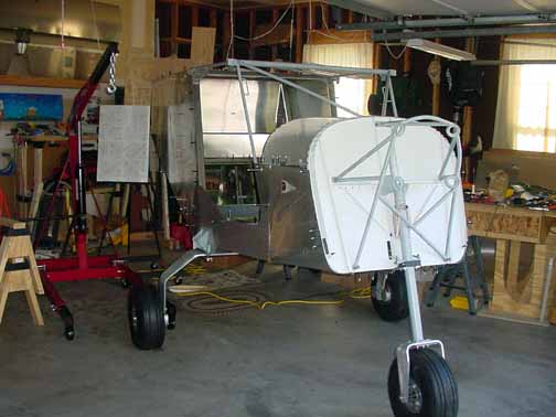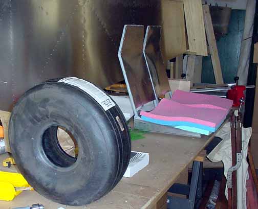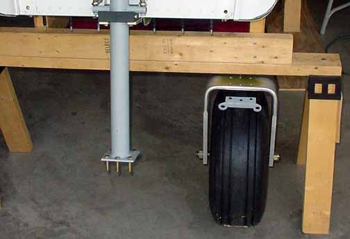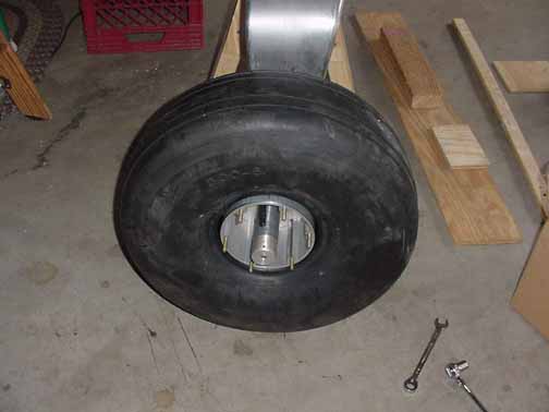 Above, the nose gear completed and waiting to be bolted. As you can see, the fuselage will need to be lifted a bit off the cradle before the nose fork can be attached, so I will wait until the main gear are on. The bolts are hanging down from the strut and will go into the fork, and then through the tow plate, which is just resting on the tire. Getting the inner tube into the tire and centered so that the air nozzle of the inner tube is at the right spot was a bit difficult, but otherwise the Matco wheel was put in place very easily. Make sure you pay attention to how the wheel is put together when you take it apart. As per the recommendations of the manual, I made a center spacer for the axle out of the same 3/4 inch 4130 tubing that I used for the FHNSF. Also, I picked up a flyer from ZAC for the 8.00 x 6 Condor tires, which stated that the tires should be inflated to 35 lbs of pressure.