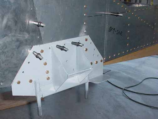 Above, the main gear support is 4130 steel and is primed and drilled into place and bolted. The holes into structural members get bolts, and holes into skin are riveted. The manual says all drilling is done from the inside of the fuse, and you need to do this to make sure the bolts come through on the center of the longerons, but I found it easier to drill through the longeron and get the hole in the support started at the right spot, and then remove the support and finish drilling it on the bench. Another tip - make sure someone looks from the bottom before you drill to see if the sides of the cabin are pulled together enough to match the bottom skin width. Using a ratcheting strap around the sides of the cabin at this point will help. A word about drilling the 4130 - it is not at all like drilling aluminum, it is very hard stuff. Use high quality cobalt steel drills, and apply some oil to the hole while drilling. They make a cutting oil for this purpose, but I just used 3 in1 oil, or you could use motor oil - you just need something to carry away the heat. If it starts to smoke, you need more oil. The air drill did not have enough torque to drill this stuff. When drilling, it is important to get a feel for the pressure and speed needed on the drill. Too much pressure, and too much heat is generated and too much torque is required - too little, and the shavings won't come out. It is important to use a variable speed drill. Too fast, and the shavings come out in chips, not a nice continual spiral. Way too fast, and drill won't bite into the steel, it will just overheat and ruin the bit. Too slow, and the bit will bite into the steel too much. Another word about this step - if you look forward to the section on mounting the wings (finish3of3-attach-wings.pdf - section 3 of the finish manual), there are instructions to drill two 5/16 holes in the gear supports where the struts go - if you wait to do that after the landing gear are on, you will have to remove the landing gear (again!) in order to do this. If you do it now, you will save yourself the tedious work of removing the landing gear while on the finished plane.