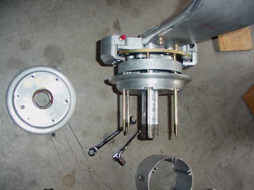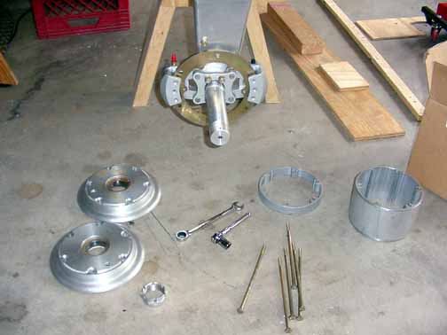 The next pieces are the long bolts that go through the disc. Onto these is the spacer ring that rides between the inside wheel hub and the disc. Then, the inside wheel hub goes onto the bolts as shown above.