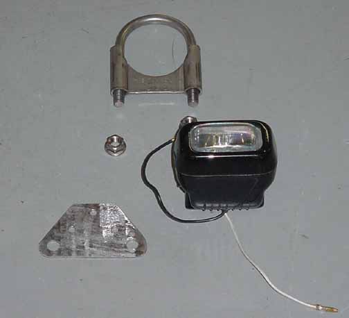 Above is my idea of a landing light - the light unit is a halogen fixture, and the U bolt and bracket is from McMaster Carr and is stainless steel, and fits the nose wheel strut perfectly - a 2 inch ID fit. The other piece is machined by me and both it and the U bolt will be powder coated, and the light attached with AN hardware.