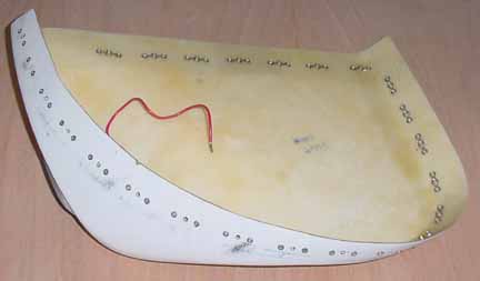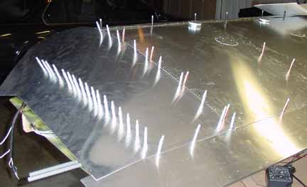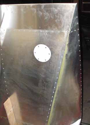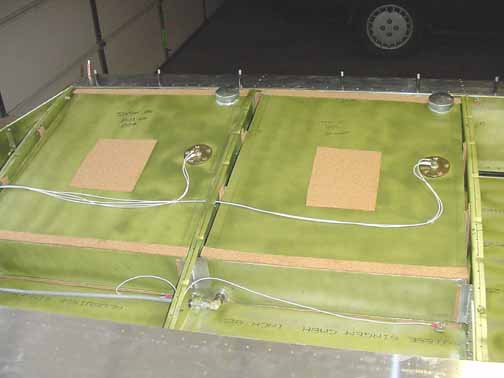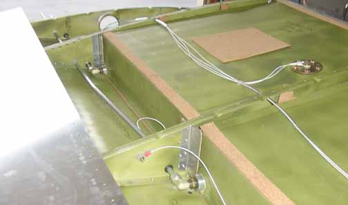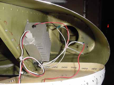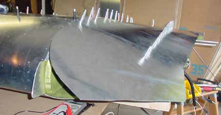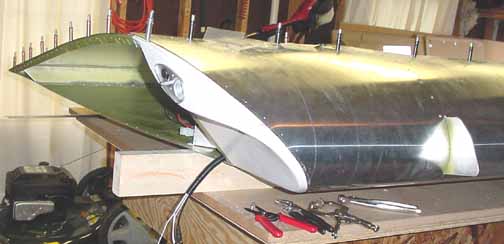 August 12, 2001 Here, the tanks are installed, wired and plumbed. Wires from the fuel gauge senders are run through plastic tubing as they pass through the ribs, and are held in place by a daub of RTV silicone. Ground wires are run from the tabs on the tanks to a bolt secured on the rib. Another shot of the plumbing. Swagelok fittings are used to route the aluminum tubing. Wires coming from both the wing tip and the fuel tanks are labeled and await a connector. Next, we cut the holes in the top skin for the fuel filler necks and the sender access panels, and cleco the top skin in place. Made 4 covers for the fuel senders with nylon plate protectors so that access can be made if necessary in the future, 2 for each wing. 3 hours. The upper skin is primed and ready to fit. Above you can see the upper skin in place with the fuel gauge sender covers riveted in place, and the root skin beginning to be clecoed in place. The rear and the pre-drilled holes have been clecoed, now all that remains is the compound wrap. Despite the instructions, this skin does not get riveted until the final assembly when the wings are attached to the fuselage, so I will tuck the sheet metal under the front and wait until that time to rivet the root end. Above, the wing tip has been trimmed, the angle flange applied to the upper tip edge, and the fiberglass nose tip is being fitted and drilled. The strobe bulb socket has also been attached to the side of the fiberglass. A critical part of the STOL feature, this Hoerner design also looks very cool. How do you cut the right lines? As Michelangelo said about sculpture, you just cut away everything that looks like it doesn't belong. Take your time, though, and sneak up on the right shape. One bad cut here and you've got a real problem. The fiberglass piece will be made removable so that the supply as well as the bulbs may be serviced. I am making it removable by using nutplates riveted on the back of the fiberglass, and 6-32 stainless screws on the front. How much weight does it add? There are 25 holes around the tip. Each nutplate weighs .700g, each screw weighs 1.00g, each used A4 rivet (without the mandrel) weighs .256g, and each 3/32 rivet is .071g (if you happen to have a lab grade scale, why not use it?) So, the attachment device weight using rivets would be (25x.256) 6.4g, and the screw/nutplate with small rivets would weigh (25x0.7)+(25x1.0)+(50x.071) = 46.0g, or a difference of 39.g. (this is just 1.4 oz.) I can live with that. I think you could get away with fewer screws, but I stayed on a 40mm pitch. 2 hrs to put on the nutplates. The strobe power supply is mounted on the spar right by the fiberglass, as below: All of the above wires will be tucked into a piece of the black sleeve and supported. Above, I've made a bracket to support the jacks for the video camera. Nutplates will be attached around the hole, giving the bottom plate something to screw into. If I don't want the drag of the camera, I can just put a blank plate on. If I want the camera, I just connect the jacks, screw the plate on, and the video signal will feed into the cockpit. For more info on the camera, go to the instruments page. Above is the mounting ring from inside the wing. It is a ring of scrap with 6 nutplates riveted to it with small flush rivets. The ring is then riveted to the wing skin with four flush rivets. This allows the cover plate or camera plate to be screwed in place flush with the skin. I cut back the wire support bracket - the original one was overkill. More black sleeve goes over the wires. Above, the wing is upright in the stand and the wingtip skins are riveted in place, and the white camera hole blank plate is screwed into the nutplates. Back to 2nd Wings Page On to 4th Wings page