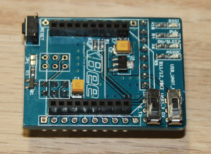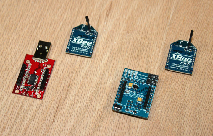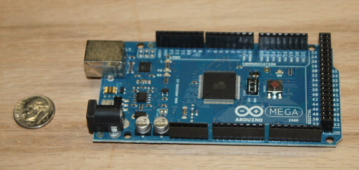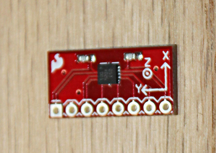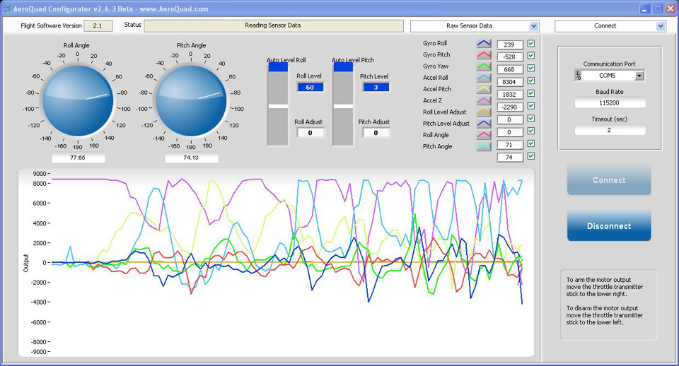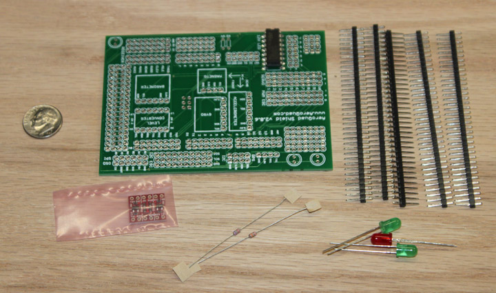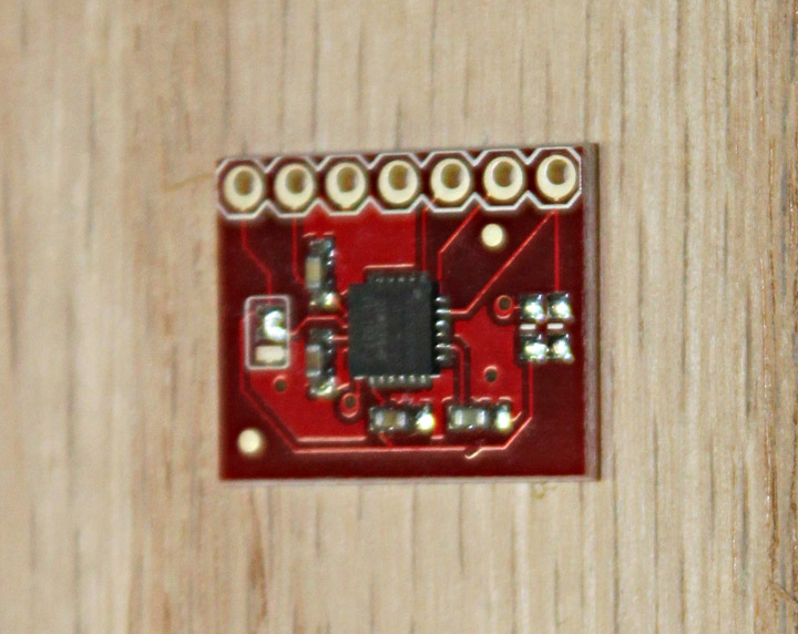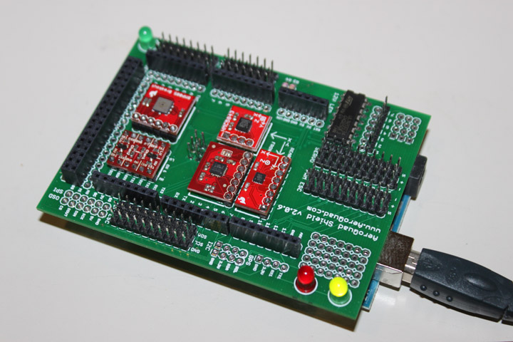Avionics - Flight Computer Fig. 10 Above is the Arduino Mega2560, which uses a Atmega2560 processor with an amazing amount of stuff built-in. The chip in the middle contains a 16 MIP RISC processor, 256K flash memory, 8K RAM, 4K EEPROM, (4) 16 bit counters, (2) 8 bit counters, (54) I/O lines, and (16) 10 bit A/D converters! Runs off of 7-12 volts and the active processor draws only 0.5 milliamps (not counting any sourced I/O.) On the lower left is the power supply socket and the upper left is a USB port for connection to the programming PC. Around the perimeter are pin sockets for "shields" which are auxiliary PC boards, made to fit this form factor, that provide application oriented hardware. Fig. 11 Above is the 2.0 shield for the Quadcopter avionics, as it comes. A few components need to be soldered, as well as a lot of pin headers for the daughter cards. Some of the pin headers will be replaced with longer ones that allow the cards to be stacked. Fig. 12 Above is the header kit for the shield, allowing the pins of the Mega to pass through and stack the boards. Fig. 13 Above is the Honeywell magnetic compass using an I2C interface, already SMT'ed to its board. Fig. 14 Above is the BMP085, a high-precision, low-power barometric pressure sensor. The BMP085 offers a measuring range of 300 to 1100 hPa with an absolute accuracy down to 0.03 hPa. It's based on piezo-resistive technology with high accuracy and linearity, as well as long term stability. Fig. 15 Above is a daughter card with InvenSense's ITG-3200, a triple-axis, digital output gyroscope. The ITG-3200 has three 16-bit analog-to-digital converters (ADCs) for digitizing the gyro outputs, a user-selectable internal low-pass filter bandwidth, and a Fast-Mode I2C (400kHz) interface. Fig. 16 This is a breakout board for Bosch's BMA180 three-axis, high performance digital accelerometer. The BMA180 provides a digital 14-bit output signal via a 4-wire SPI or I2C interface. The full-scale measurement range can be set to ±1g, 1.5g, 2g, 3g, 4g, 8g or 16g, snad performs a self-test on power up. Fig. 17 Above is a daughtercard for an XBee RF transmitter/receiver to interface to the Quad 2.0 shield to provide telemetry to a ground station. Fig. 18 Figure 18 shows the whole Xbee "suite" - on the left is a USB-to-Xbee adapter, with an Xbee 60 mW 2.4 GHz transceiver next to it showing a whip antenna. On the right is the Quad Sheild-to-Xbee adapter that has another Xbee transceiver that plugs into it. Together, these components constitute a high speed serial radio link between the ESPCopter and a laptop on the ground. Fig. 19 Figure 19 shows the completed avionics deck for the 2.0 shield, with it plugged into the Mega2560 board underneath. It is plugged into a USB port for power and has the Aeroquad flight software downloaded and executed. The green LED on the lower right side is on, indicating that it's running. As shown, the flight computer (w/o the USB cable) is rather dense at 91 grams. The XBee components are not plugged in yet. Fig. 20 Figure 20 shows a screen from the configurator that allows you to see the values being generated by the flight computer in Figure 19 as I move it about in the air. It is very interesting to watch how the values change with the gyrations of the board as I pick it up and fly it around. Making motor noises while doing so is optional. :^) |